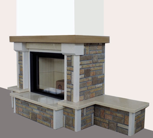 Каминная облицовка с банкетой 70 см. Основной материал: рваный Vicentino. Материал полки: полированный Trani.
